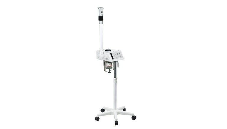 Vaporizador con ozono digital de alta gama con estructura metálica en blanco de gran estabilidad con brazo rotativo. Equipado con cabezal orientable y giratorio con receptáculo esenciero. Incluye depósito para hierbas en el vaso. Altura regulable y base con ruedas para facilitar el desplazamiento.